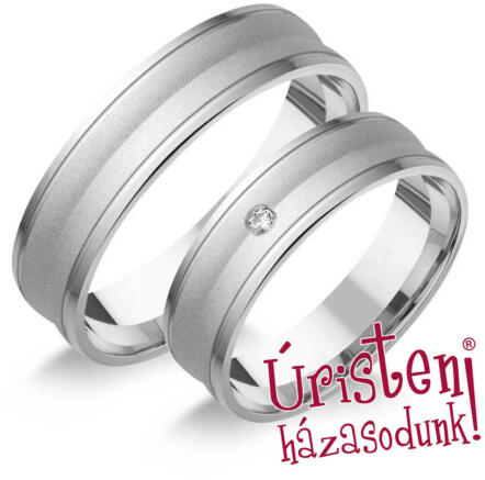 Modern, fehér arany karikagyűrű, homorú külső profillal és kényelmes, enyhén domború belső profillal. A női gyűrűt 1 gyémánt kő ékíti.