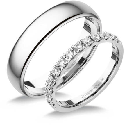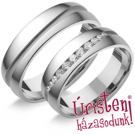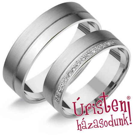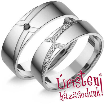 Modern, fehér arany karikagyűrű, lapos külső profillal, vésésekkel díszítve. A női gyűrű 16 fehér gyémánt kővel, a férfi gyűrű 1 fekete gyémánt kővel ékített.