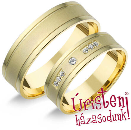 Különleges, sárga arany karikagyűrű, 6 mm széles sínnel, középen matt, szélén fényes felülettel, modern kövezéssel. A női gyűrűt 7 gyémánt kő ékíti.