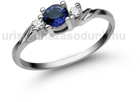 Csavart fazonú eljegyzési gyűrű kék zafír kővel középen és 1-1 cirkónia kővel oldalt.