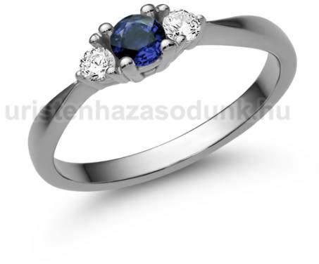 3 köves fehér arany eljegyzési gyűrű, kék zafír kővel középen és 2 darab gyémánt kővel oldalt.