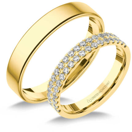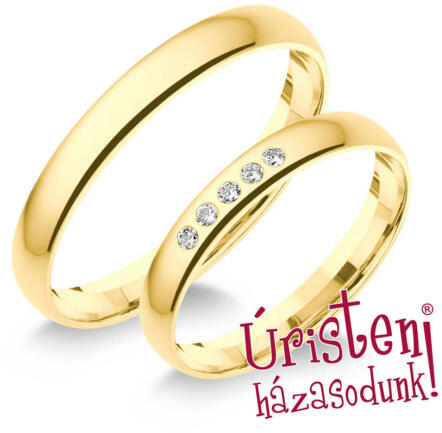 Vékony, klasszikus, sárga arany karikagyűrű, fényes felülettel. Kívül-belül domború, kényelmes viselet. A női gyűrű gyémánt kövekkel ékített.