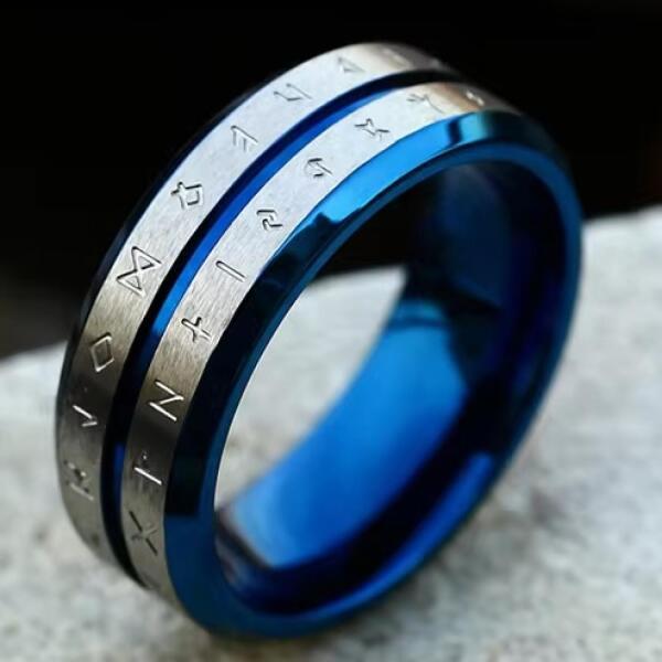 Ruben Gyűrű Modern, rúnákkal díszített gyűrű az elegáns kialakítást köti össze a titokzatos, ősi szimbolikával. A fényes kék színű fém és a matt ezüst sávok kombinációja kifinomult és egyben mutatós ékszert alkot. Ez a gyűrű ideális olyan urak számára, akik modern ékszert keresnek, melyben található egy csipet misztikusság és történelem. Nem csak hétköznap