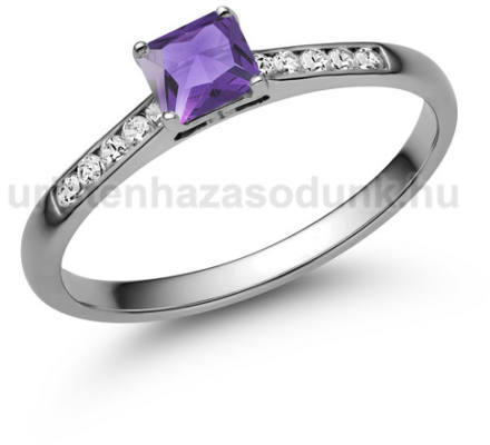 Exkluzív megjelenésű, oldalt köves fehér arany eljegyzési gyűrű ametiszt kővel és cirkónia kövekkel.
