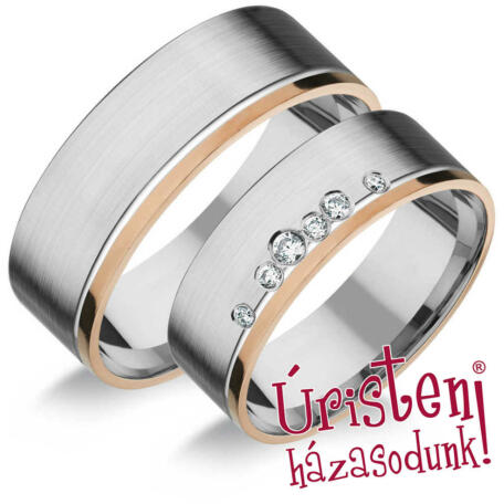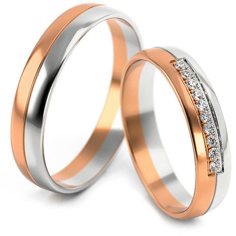 Rabul ejtik Önt eleganciájukkal. Kombinált, aranyból készült jegygyűrűk, domború külső profillal. Ezek a 3 - 5 mm széles karikagyűrűk belső lekerekített profillal rendelkeznek, a nagyobb kényelem érdekében. A gyűrűk központi dísze egy barázda, amely kétfelé osztja azokat, az egyik felük rózsaszín, a másik pedig fehér arany, a női gyűrűt tíz darab ragyogó cirkon