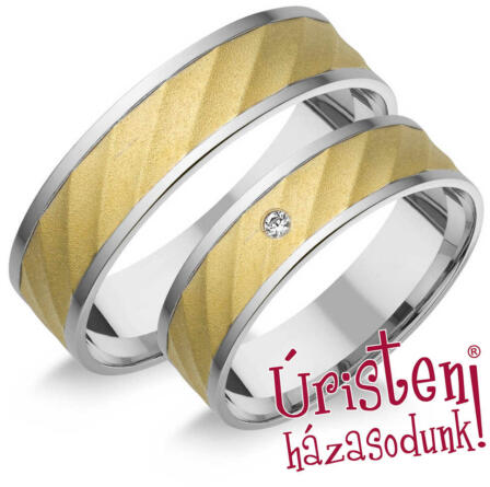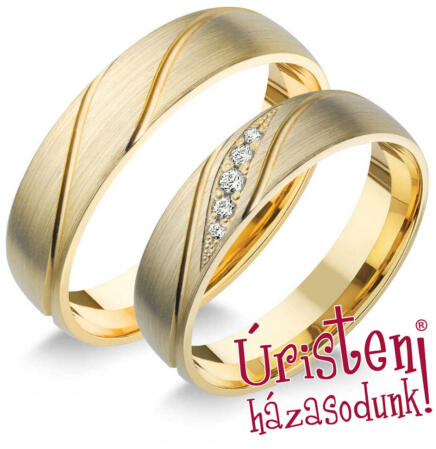 Különleges, sárga arany karikagyűrű, finom, hullámos vésésekkel, fényes és matt felülettel, enyhén domború külső-belső profillal. A női gyűrűt 5 gyémánt kő ékíti, nyújtott, mandula formájú foglalatban.