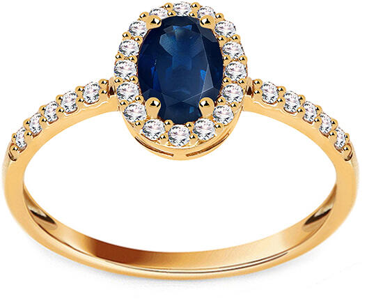 Gyönyörű antik gyűrű sárga aranyból. A gyűrűt ovális, sötétkék szimulált zafír díszíti, amelyet kisebb átlátszó cirkóniák vesznek körül. A gyűrűs karika elülső fele átlátszó cirkóniákkal van kirakva.