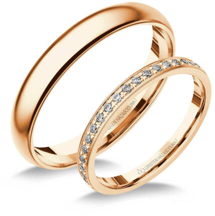 Klasszikus, fényes felületű karikagyűrű rozé aranyból. A női gyűrű cirkónia kövekkel díszítve.