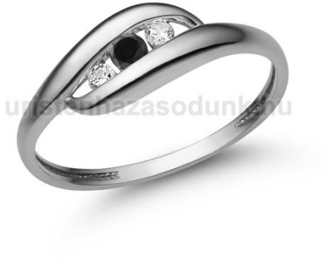 Csavart fazonú eljegyzési gyűrű, 3 darab fekete gyémánt kővel és cirkónia kövekkel, fehér arany foglalatban.