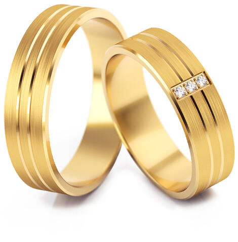 Sárga, 14 karátos aranyból készült jegygyűrűk lapos profillal, a Soul kollekcióból. Ezek az 5,3 mm széles karikagyűrűk belső lekerekített profillal rendelkeznek a nagyobb kényelem érdekében. A gyűrűk központi díszét két vonal alkotja, magasfokú polírozással, finom dombornyomással kombinálva a karikagyűrűk egész felületén, három darab tündöklő cirkonnal díszít