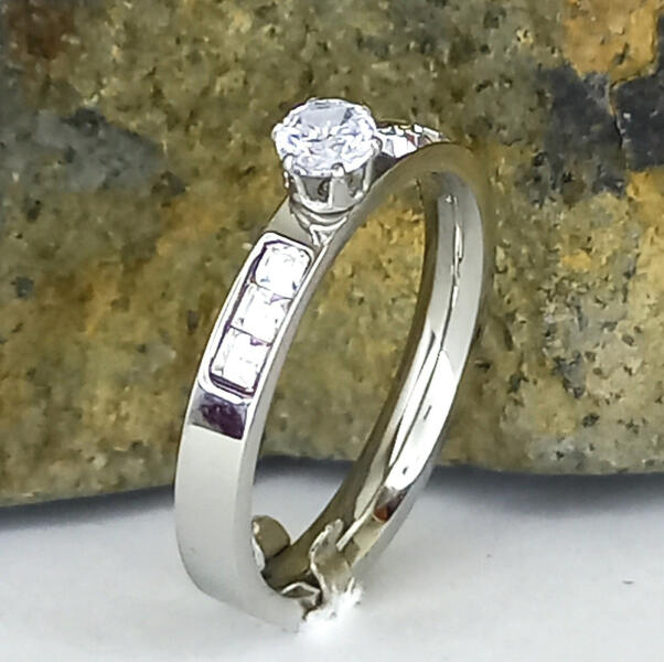 Ezüstszínű nemesacél ( 316L ) gyűrű fehér cirkónia kristály díszítéssel. A kristályok ragasztott és karmos foglalatban helyezkednek el. Időtálló darab, nem feketedik, mindennapi viseletre is alkalmas. Antiallergén ékszer. Gyűrű szélessége: 3 mm. A nemesacél ékszerek rendkívül népszerűek kedvező tulajdonságaik miatt. A nemesacél semmilyen nikkelsót nem bocsájt ki m