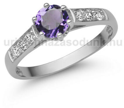 Modern, nőies fehér arany eljegyzési gyűrű 5 mm-es ametiszt kővel középen és 3-3 cirkónia kővel oldalt.