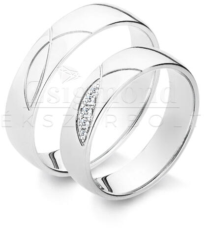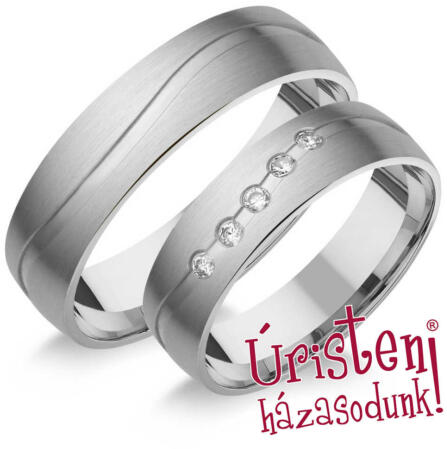 Modern, fehér arany karikagyűrű, hullámos véséssel. A női gyűrű 5 gyémánt kővel ékített.