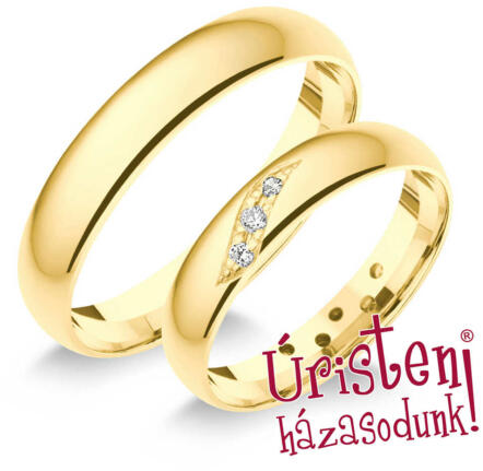 Hagyományos, sárga arany karikagyűrű. Kézzel készítve, 3 cirkónia kővel díszítve, különleges foglalatban.
