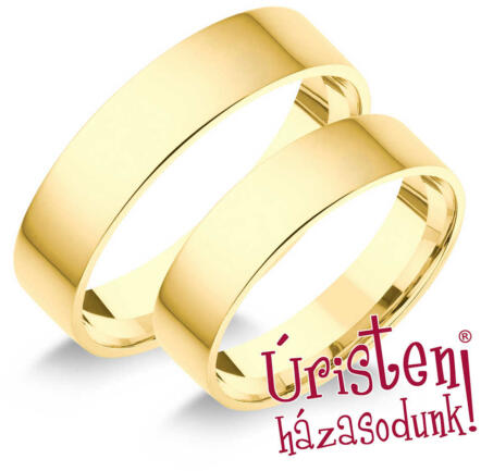 Hagyományos, sárga arany karikagyűrű, lapos külső profillal, 5 mm széles sínnel, kő nélkül.