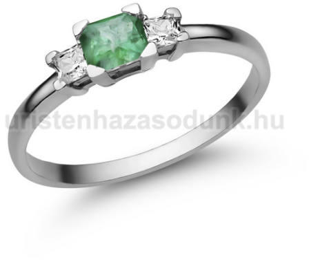 Modern, 3 köves eljegyzési gyűrű, szögletes smaragd kővel és 1-1 gyémánt kővel odlalt.