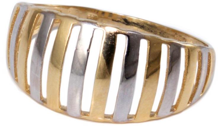 Egyszerű és mutatós, enyhén domború, sávosan áttört, ródiummal díszített arany gyűrű.