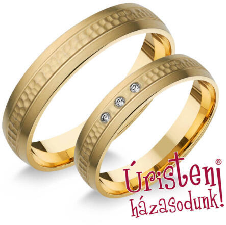 Matt, sárga arany karikagyűrű, enyhén domború külső-belső profillal, párhuzamos véséssel. A női gyűrűt 3 cirkónia kő díszíti.