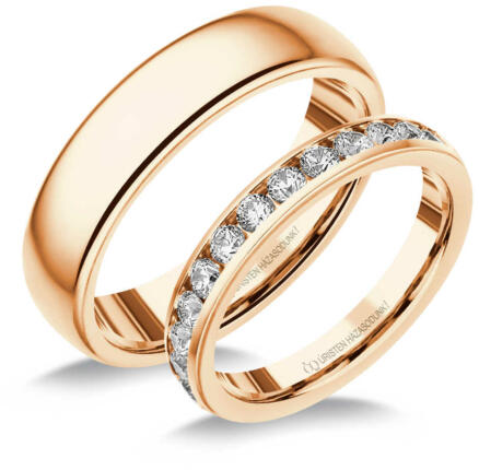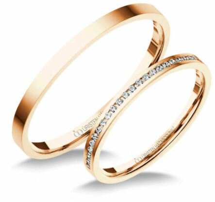 Hagyományos, 5.5 mm széles, rozé arany karikagyűrű. Kívül-belül domború profillal, kényelmes viseletet biztosítva. A női gyűrű gyémánt kövekkel ékített.