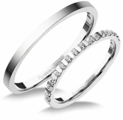 Vékony, klasszikus, fehér arany karikagyűrű. Fényes felülettel, a női gyűrű gyémánt kövekkel ékítve.