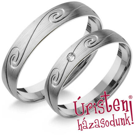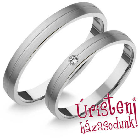 Vékony, fehér arany karikagyűrű, középen vésett, matt és fényes felülettel. A női gyűrű cirkónia kővel díszített.