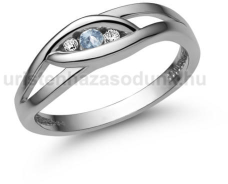 Praktikus viselésű, fehér arany eljegyzési gyűrű akvamarin kővel és gyémánt kövekkel, mandula formájú, finom foglalatba zárva.