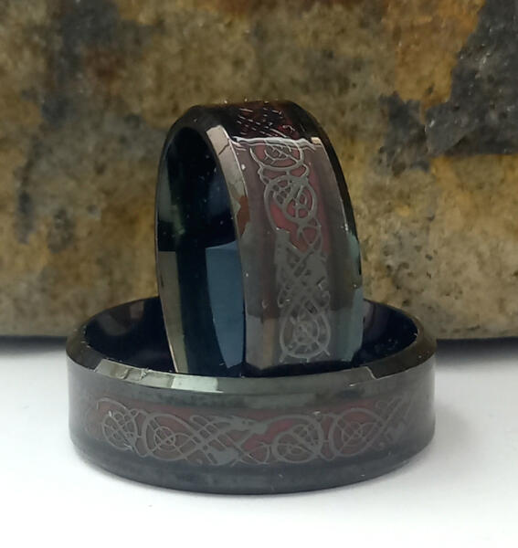 Fekete színű nemesacél (316L) gyűrű, melyet sötét barna középkori minta díszít. Minőségi anyagának köszönhetően mindennapi használatra is alkalmas. Gyűrű szélessége: 8 mm. Antiallergén ékszer. A gyűrű belseje gravírozható. A gravírozás mélysége miatt a gravírozott minta ezüst színű, látványosabb lesz. A nemesacél ékszerek rendkívül népszerűek kedvező tu