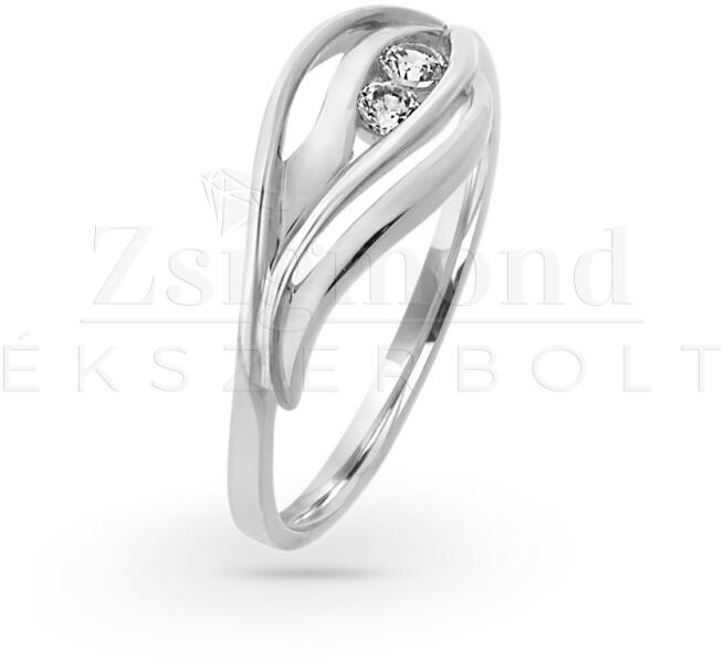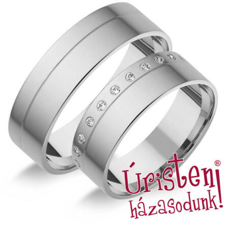 Széles, fehér arany karikagyűrű, szolid véséssel, fényes felülettel. A női gyűrű 12 gyémánt kővel ékített.