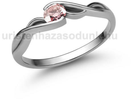 Praktikus viselésű eljegyzési gyűrű, csavart foglalattal, rózsaszín zafír kővel a közepén.
