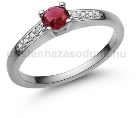 Modern, fehér arany eljegyzési gyűrű rubin kővel középen és cirkónia kövekkel oldalt.