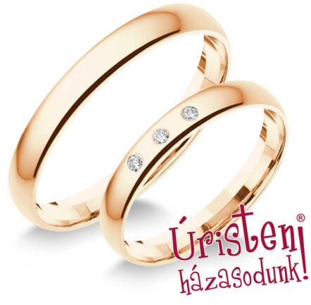 Kézzel készült, klasszikus, rozé arany karikagyűrű, 3 gyémánt kővel ékítve.
