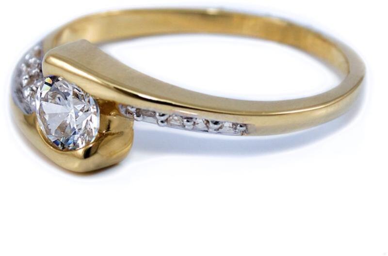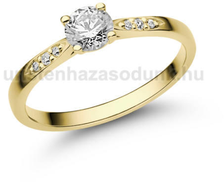 Modern, sárga arany eljegyzési gyűrű, középen egy 4.5 mm átmérőjű cirkónia kővel, mellette 6 további cirkónia kővel.