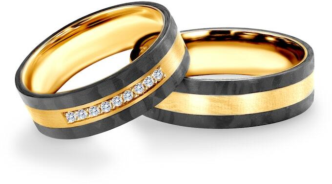 Esküvői karikagyűrűk: karbon és arany, lapos, 6 mm