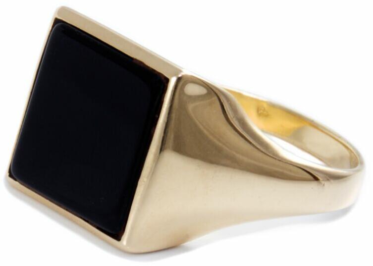 Modern stílusú, kedvelt fazonú, fekete színű műtermékkel díszített masszív kialakítású arany férfi pecsétgyűrű.