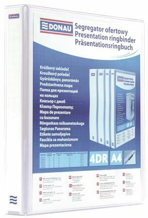 panorámás gyűrűskönyv mindkét oldalán ragasztott és széleken hegesztett PP fólia borítással a buborékmentes és minõségi megjelenés érdekében 2 külsõ zseb a megszemélyesítéshez 2 belsõ zseb jegyzeteknek tartós PP borítás kívül és belül 16 mm átmérõjű, 4 "D" gyűrűs szerkezet
