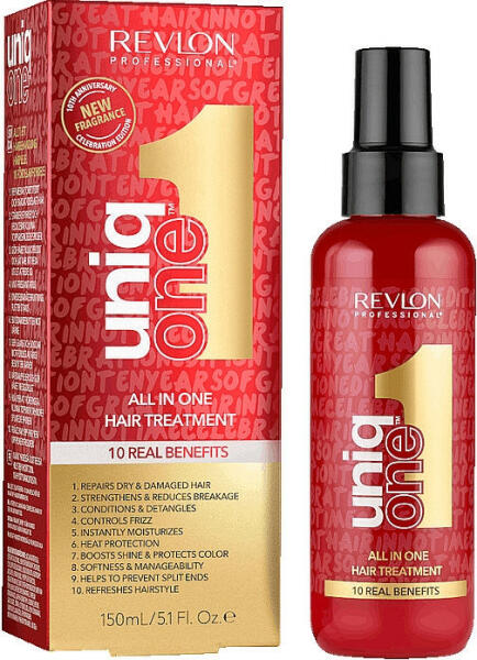 Revlon Professional Uniq One Celebration spray, 150 ml - Hajápoló és hajformázó spray koncentrátum - Új illat, amely megőrzi ikonikus klasszikus karakterét, mégis egy kicsit más - Illata a mai nő személyiségét tükrözi: Egyszerre merész, friss és modern - Az új Revlon Uniq One illat spontán, szabad szellemű, és egyedülálló öröm- és szabadságérzetet sugároz A Revlon P