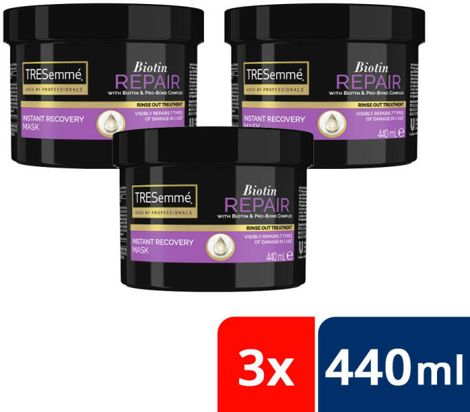 Biotin + Repair 7 hajpakolás mélyen táplálja a hajat és azonnal segít könnyebben kezelhetővé tenni! TRESemmé Biotin Repair 7 hajpakolás károsodott hajra biotinnal 3x440 ml Ez a koncentrált formula segíti helyreállítani a töredezett hajat és megvédeni azt a jövőbeni károsodásoktól. Használja a TRESemmé Biotin Repair sampon után, vagy a TRESemmé Biotin Repair hajbalzsam u