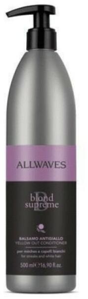 Hajápoló > HajbalzsamAllwaves Blonde Supreme hamvasító balzsam, 500ml- Melírozott, szőkített és ősz hajra - A Blond Supreme sampon használata után segít eltávolítani a sárga tónusokat a hajból - Puhává és testessé teszi a hajat, anélkül, hogy maradványanyagokat hagyna Használata: - Megfelelő védőkesztyűt viselve vigye fel nedves hajra, majd masszírozza bele - Hagyj