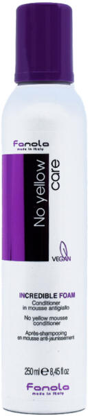 A Fanola No Yellow Incredible Foam kondicionáló kiegészíti a Fanola No Yellow termékcsaládot a szőke haj számára, és garantálja a haj számára a kiváló színeredményt és az intenzív táplálást. A balzsam enyhén habos állagú, amely még a legfinomabb hajra is alkalmas, amelyet semmilyen módon nem terhel. A lila pigmentek gondoskodnak a nem kívánt sárga szőke tónus eltáv