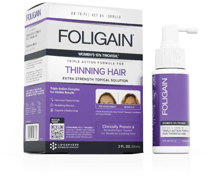 A Foligain Triple Action Complete Formula For Thinning Hair For Women 10% Trioxidil hajerősítő szérum nőknek hajritkulás és hajhullás ellen a 10% Trioxidil, dihidrotesztoszteron (DHT) blokkolók, biotin, válogatott vitaminok és erőteljes gyógynövénykivonatok segítségével erősíti és feszesebbé teszi a hajszálakat. A trioxidil hatóanyag erősíti a hajat a gyökerektől a hajv