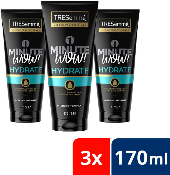 A TRESemmé Hydrate&Purify 1 Perces Intenzív Hajpakolás koncentrált formulája hialuronsavat tartalmaz, szabadalmaztatott Pro-Bond Complex technológiája a hajszálak belsejébe hatol és segít megerősíteni a haj szerkezetét, hidratált és fényes hajat kölcsönözve. TRESemmé Hydrate & Purify 1 Perces Intenzív Hajpakolás száraz hajra hialuron savval 3x170 ml AZONNALI HIDRAT