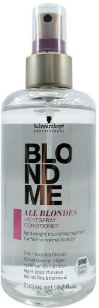 Hangsúlyozza a szőke haj természetes szépségét a szakemberek minőségi gondozásával, és támogassa ragyogó megjelenésüket. Schwarzkopf Professional BlondMe All Blondes Light Spray Conditioner öblítés nélküli kondicionáló spray a gyenge, finom vagy normál szőke hajhoz, felfrissíti a hajat, ragyogó fényt ad, intenzív ápolással, táplálással és hidratálással látja el