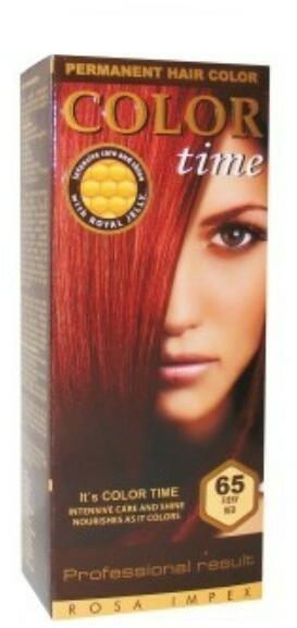 Color Time tűzvörös hajfesték 65 Hivatalos magyarországi forgalmazótól. Leírás: Color Time hajfesték tartós hajfesték méhpempővel. A méhpempő regenerálja, hidratálja és vitalizálja a hajat, csillogást és intenzív ápolást nyújt. A Color Time gél formula hihetetlen színállóságot biztosít. Szín pigmentek a zselével kombinálva mélyen behatolnak a haj belsejébe ezá