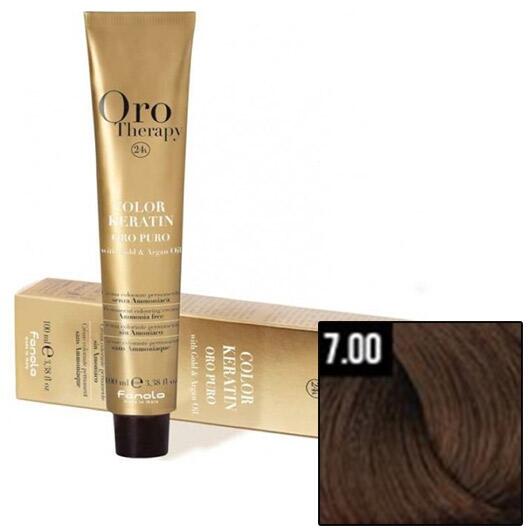FANOLA ORO Therapy 24K Ammonia Free Permanent Color 7.00 100 ml: A Fanola Oro Therapy 24K Ammonia Free Permanent Color tartós ammóniamentes hajfesték ideális a tökéletes divatszínek kíméletes megfestésére. A színpigmenteket a hajfestékben az arany mikrorészecskék aktiválják és felerősítik, amelyek a haj szerkezetébe jutnak. Segít megőrizni a haj egészséges állapotát a ke