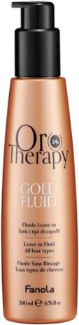 FANOLA Oro Therapy Gold Fluid 200 ml A hajban maradó ragyogást adó fluid tejszerű és krémes állaga gyors és hatékony alkalmazást tesz lehetővé. Ideális a kutikula lezárására. Szilikontartalma biztosítja a haj fésülhetőséget megkönnyítve a beszárítást. Ideális minden hajtípusra. Egységesíti a hajszálat és megkönnyíti a kifésülést. Eredmény: selymes és ragyogó