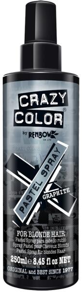 CRAZY COLOR Pastel Spray - Graphite 250 ml: Szórakoztató, színes csíkok azonnal szőke hajra! Legfeljebb 3 mosásig tart. A Crazy Color pasztell árnyalatú színes spray-k különleges alkalmakra vagy eseményekre használhatóak szőkített vagy szőke hajtincsekre. Körülbelül három hajmosásig tartja meg a színt a hajban. Minden Crazy Color pastell spray ammónia és a peroxid mentes,