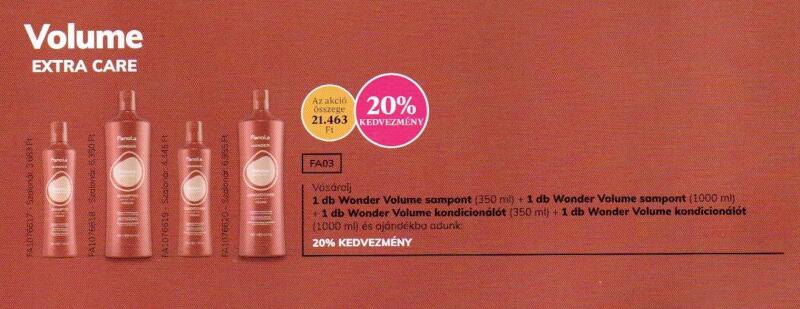 FA03 FANOLA Wonder Volume Termékbemutató AKCIÓ 20% Egy nagyszerű lehetőség, hogy kipróbáld a FANOLA Wonder Volume termékeit most még kedvezőbb áron! Vásárolj 1 db Wonder Volume sampont 350 ml + 1 db Wonder Volume sampont 1000 ml + 1 db Wonder Volume kondícionálót 350 ml + 1 db Wonder Volume kondícionálót 1000 ml! A kedvezmény mértéke 20 %
