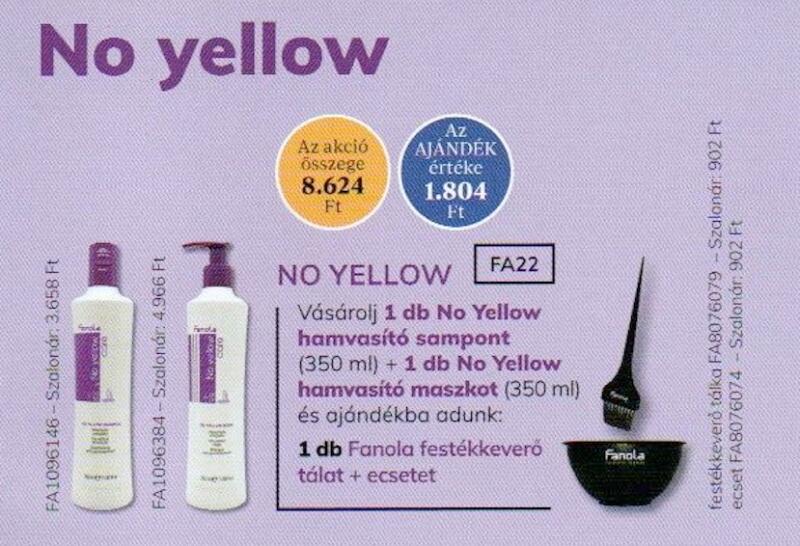 FANOLA No Yellow Sampon & Maszk 350 ml 42+1 AKCIÓ: Egy nagyszerű lehetőség, hogy kipróbáld a FANOLA No Yellow Sampon és Maszk 350 ml válltozatát! Vásárolj 1 db FANOLA No Yellow Sampon 350 ml-t és 1 db FANOLA No Yellow Maszk 350 ml-t és mi megajándékozunk: Ajándék termék: -1 db FANOLA festékkeverő tál -1db FANOLA ecset Az ajándék értéke: 1.805- Ft Az ajándék termékek
