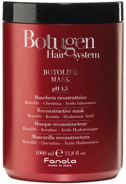 FANOLA Botugen Botolife Mask 1000 ml - Szerkezethelyreállító maszk: Botolife - Keratin - Hialuronsav Sűrű, krémes, hatóanyagokban gazdag formula. Lezárja a sérült hajszerkezetet. Megkönnyíti a belső rekonstrukció folyamatát. Selymessé, rugalmassá, fényessé teszi a hajat. Érintkezve a hajban lévő nedvességgel, a Botolife molekula kitágul, egy háromdimenziós hálóvá váli