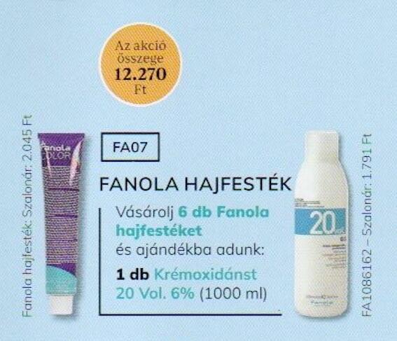 FANOLA Color hajfesték 6 + 1x 6% Oxi AKCIÓ: Egy nagyszerű lehetőség, hogy kipróbáld a FANOLA Color 100 ml-es hajfestéket még kedvezőbb áron! Vásárolj 6 db FANOLA Color 100 ml hajfestéket és mi megajándékozunk: Ajándék termékek: - 1 db FANOLA Hydrogén-Peroxid 20 VOL. 6% 1000 ml Az ajándék értéke: 1.790- Ft A megrendelni kívánt hajfestékek pontos színkód számát és da